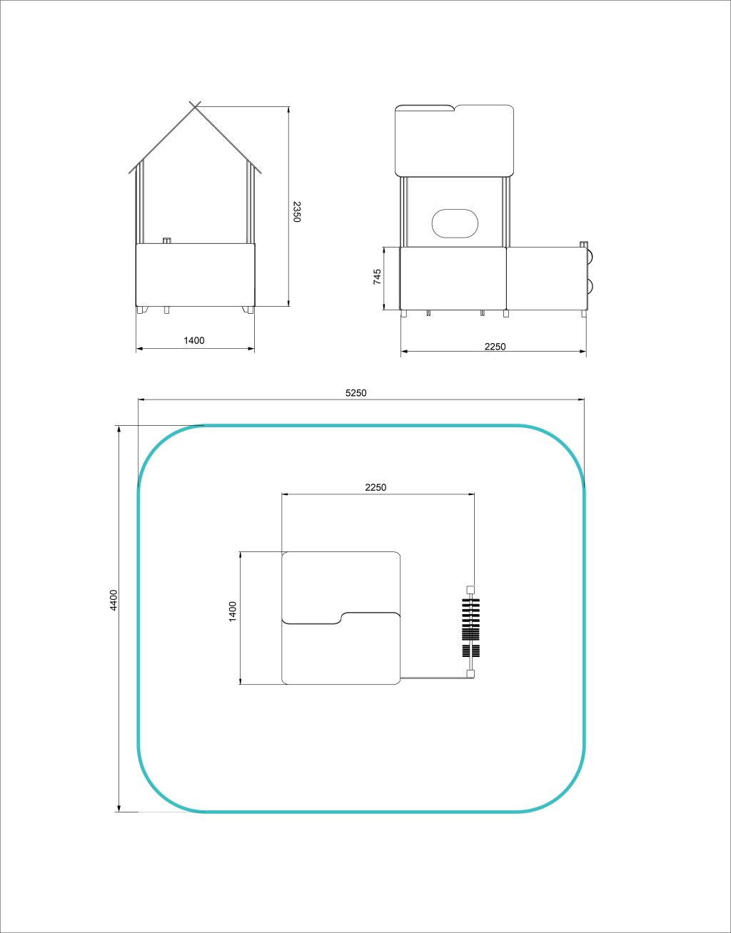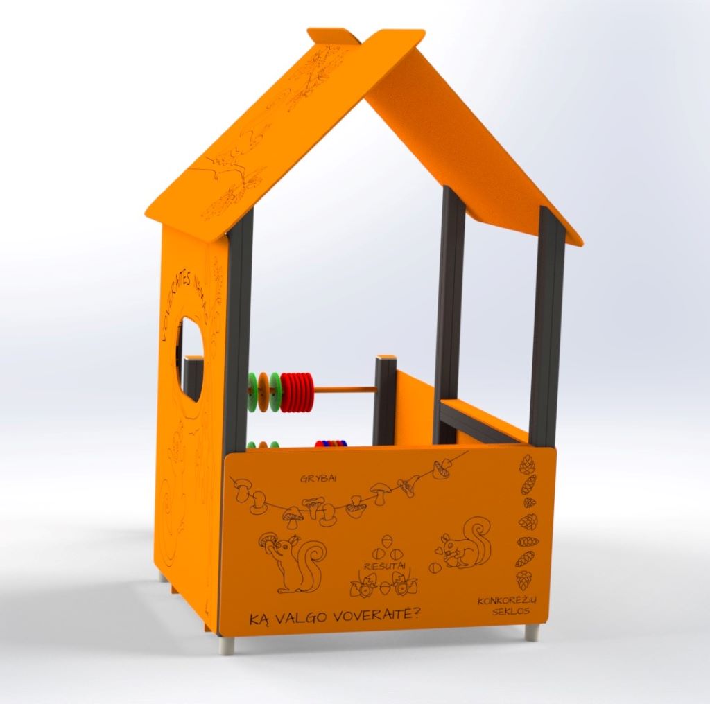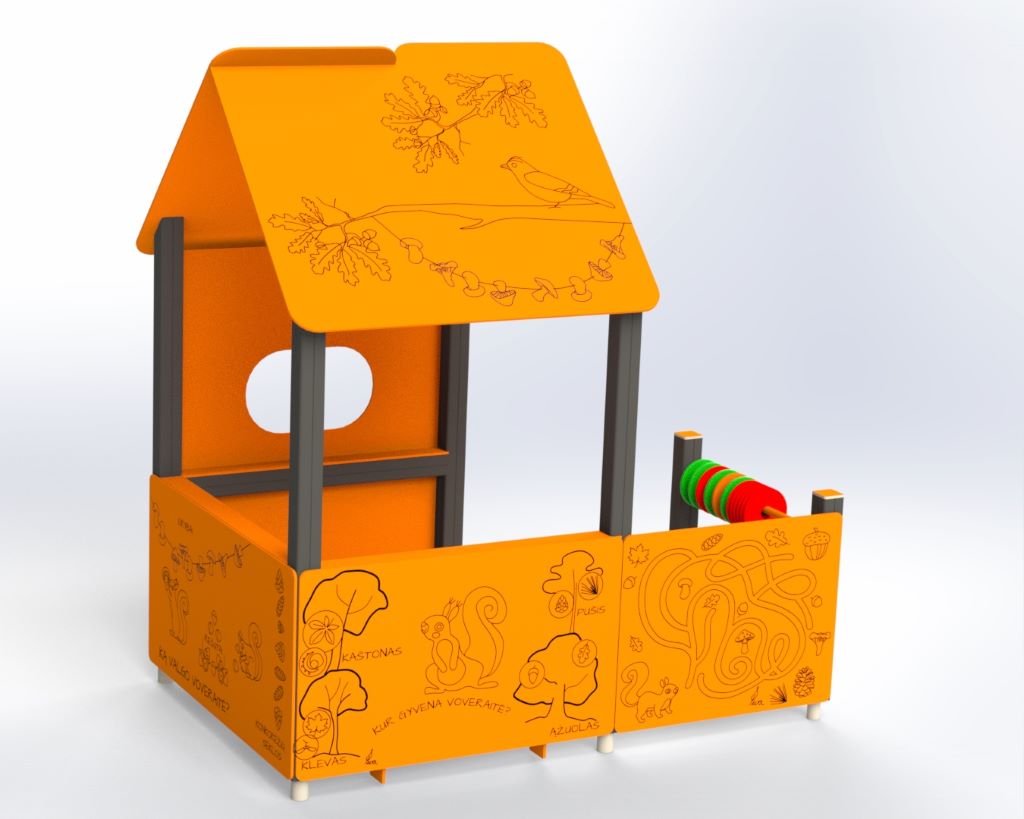Namelis/pavėsinė su edukaciniais žaidimais ir suoliukas.