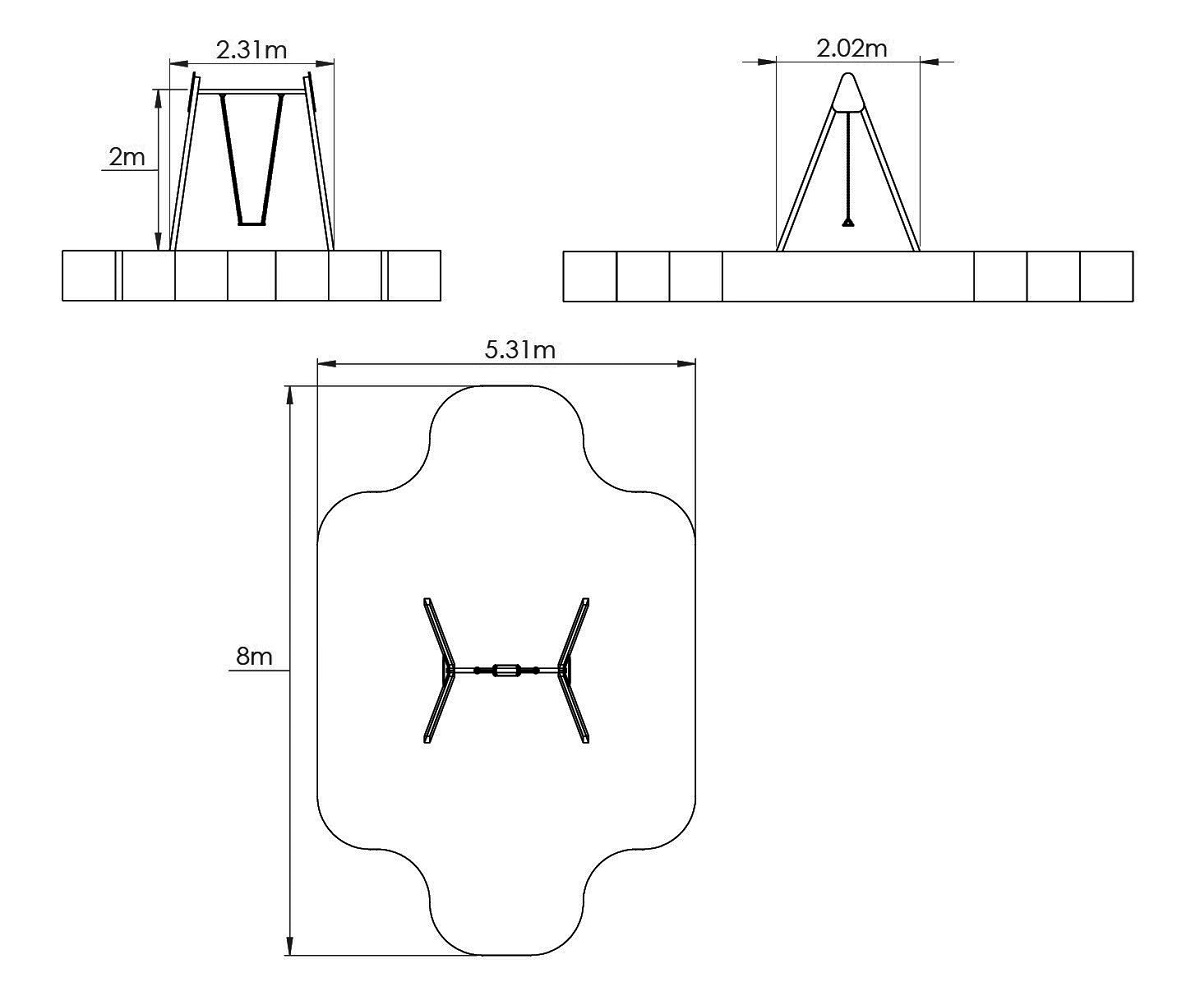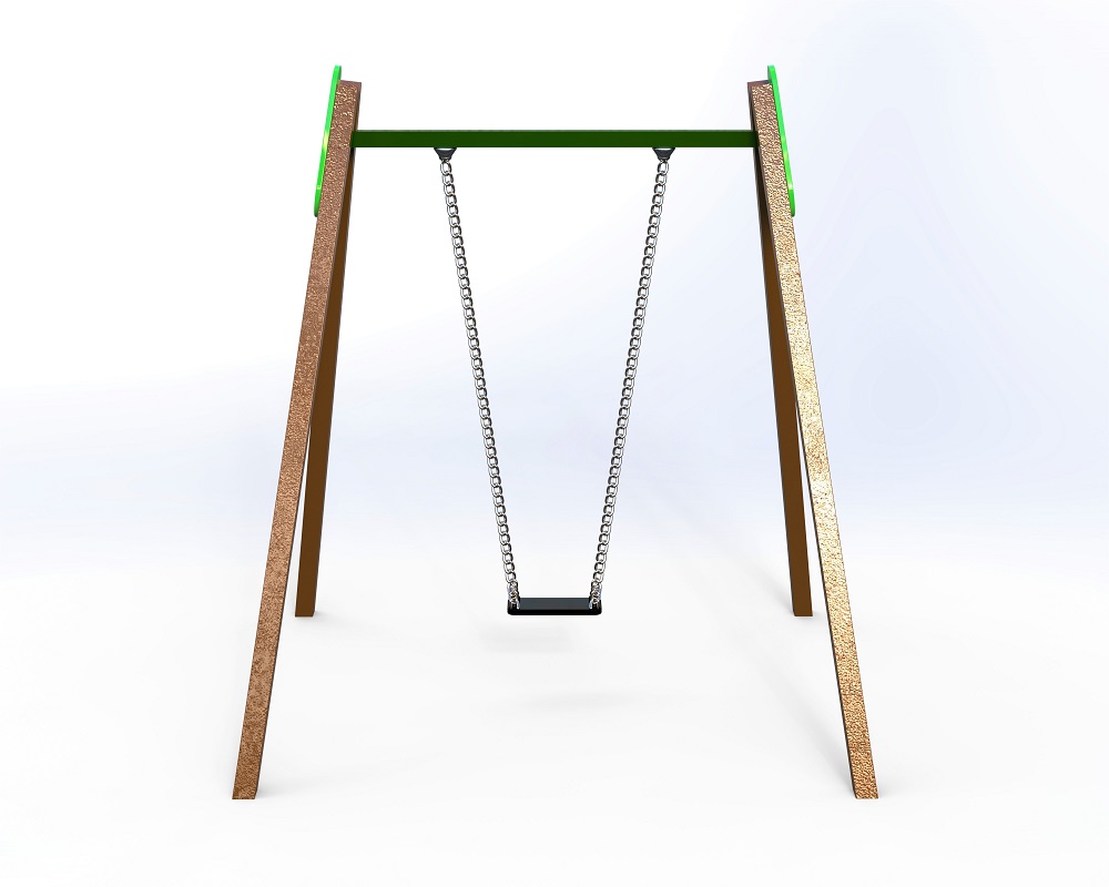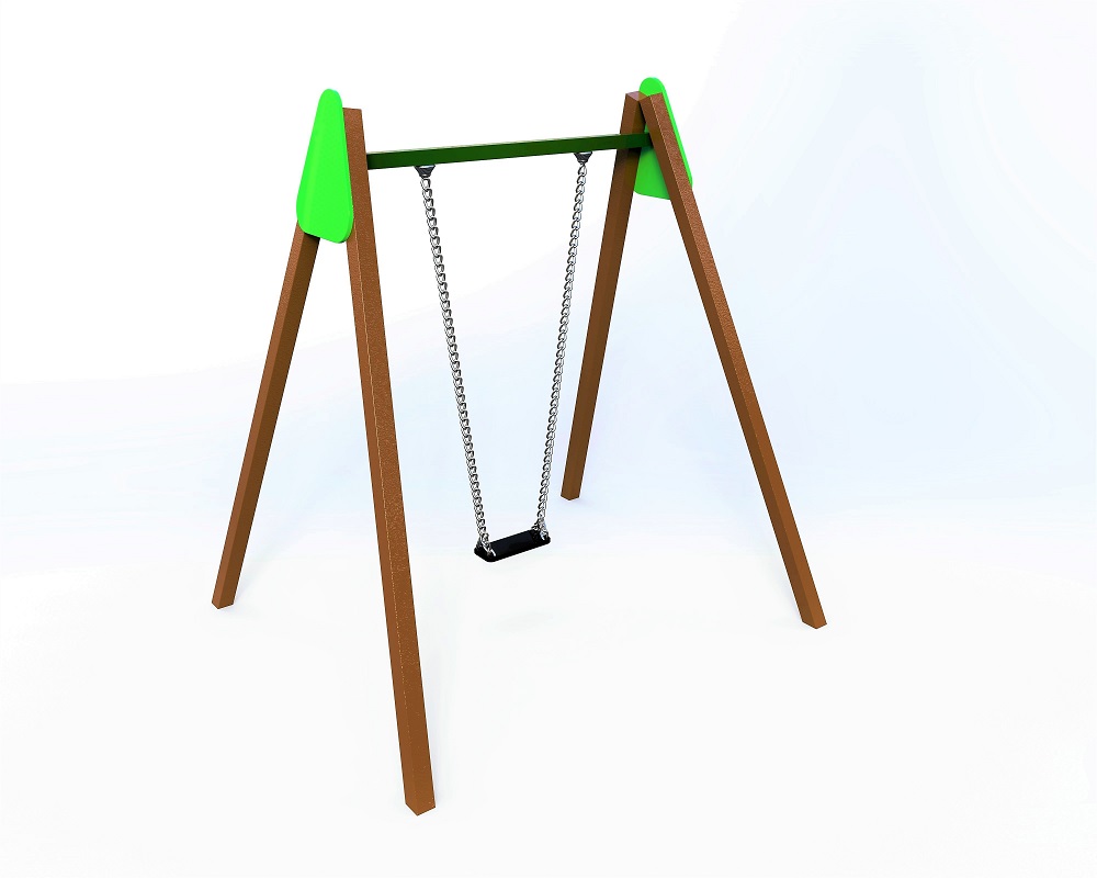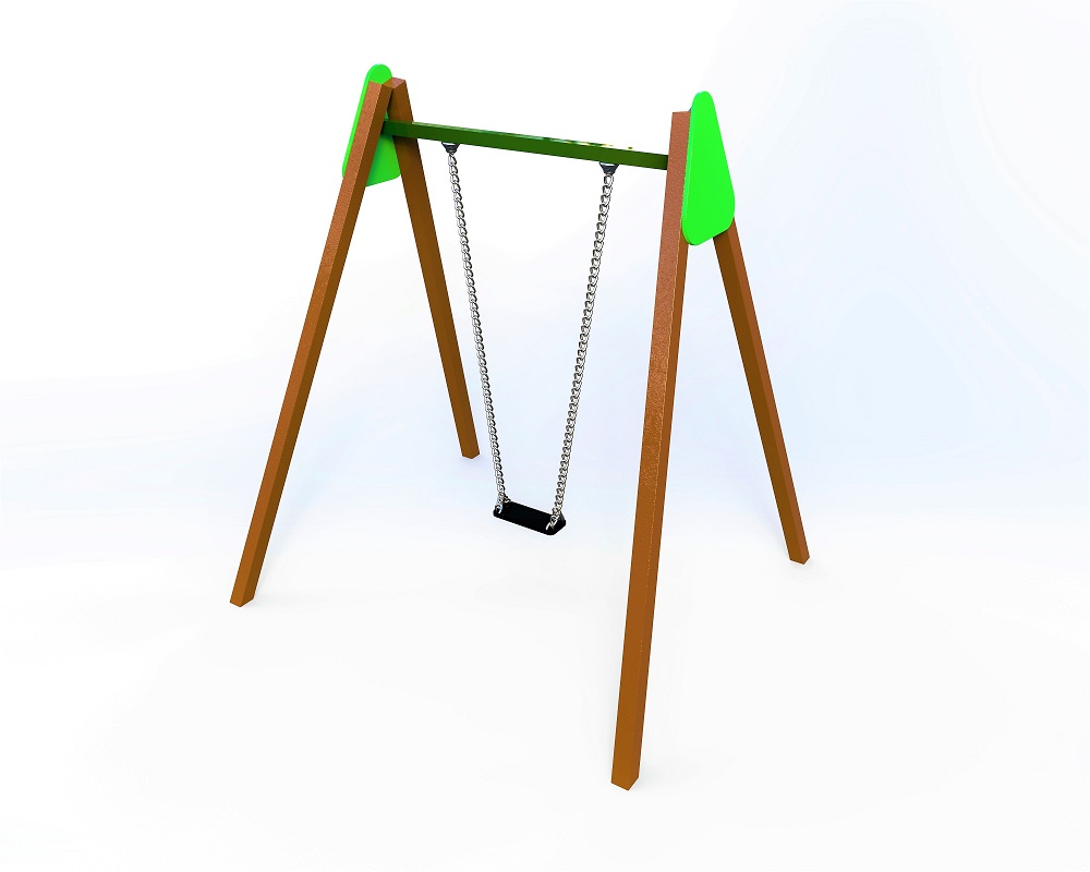 Švytuoklinės sūpuoklės vienam vaikui. Milteliniu būdu dažyti metaliniai stulpai ir skersinis, HDPE plastiko apdailos detalės, sertifikuoti, karšto cinkavimo, patvarūs pakabinimo elementai ir sūpuoklių sėdynė.