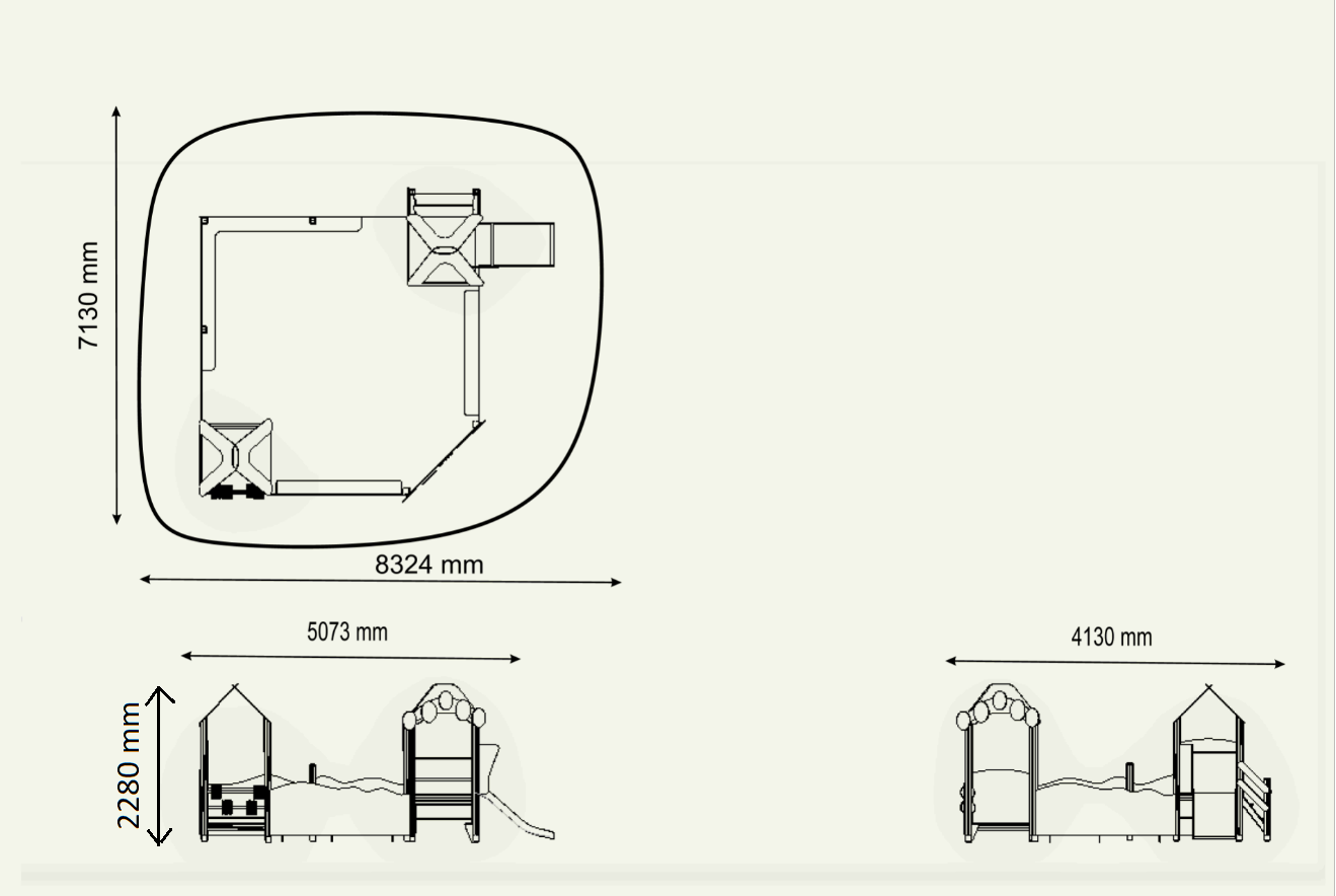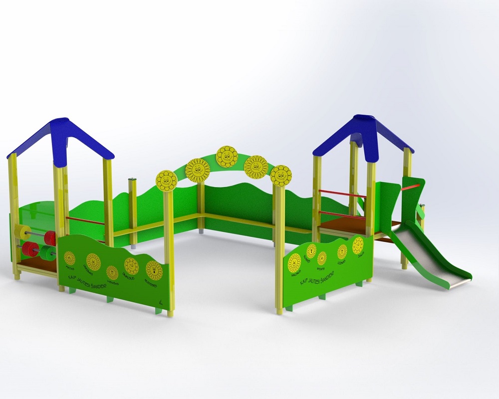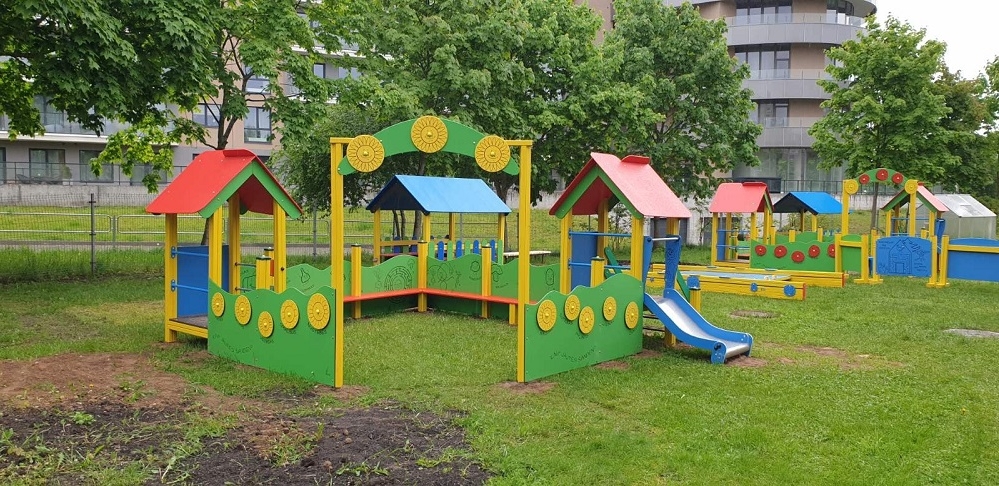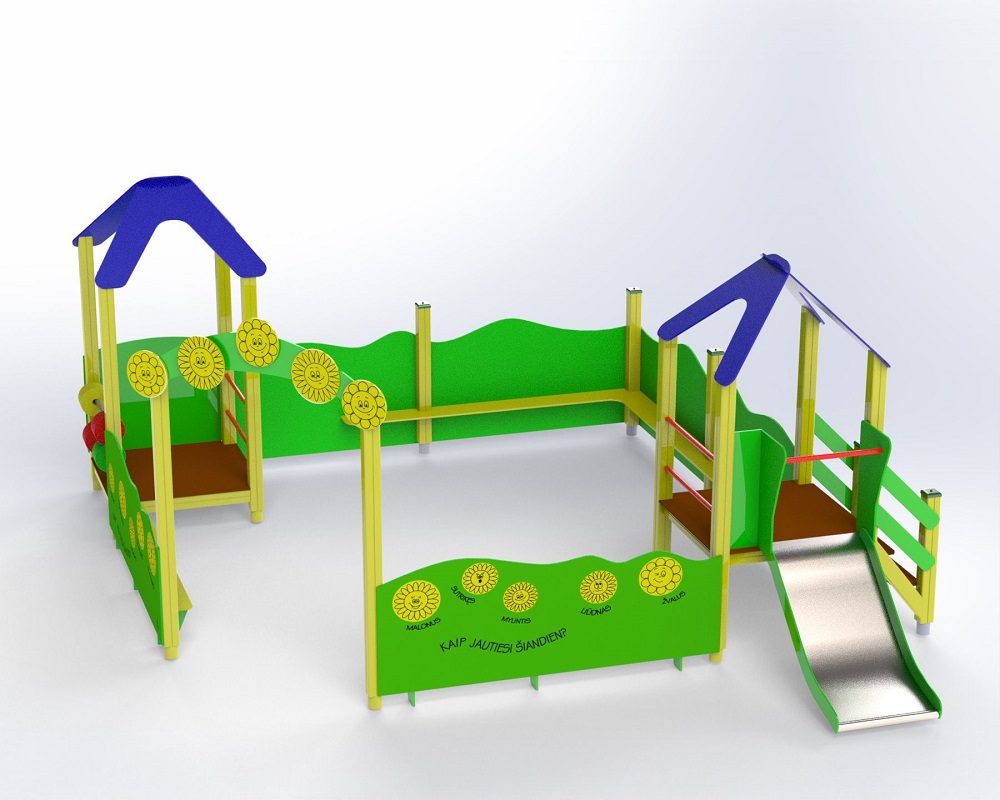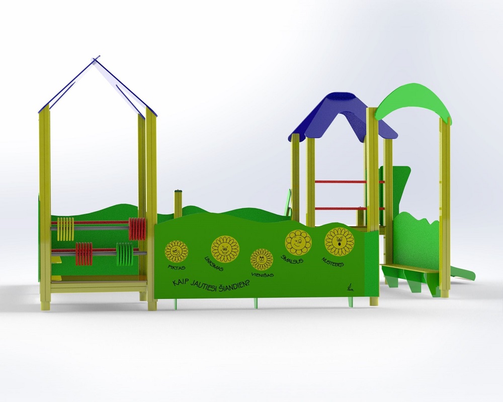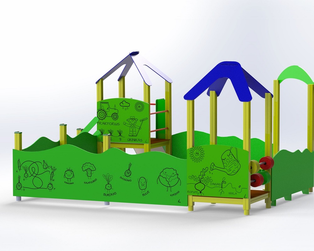 Du bokšteliai, čiuožyklėlė, laiptukai, edukaciniai žaidimai, suoliukai.