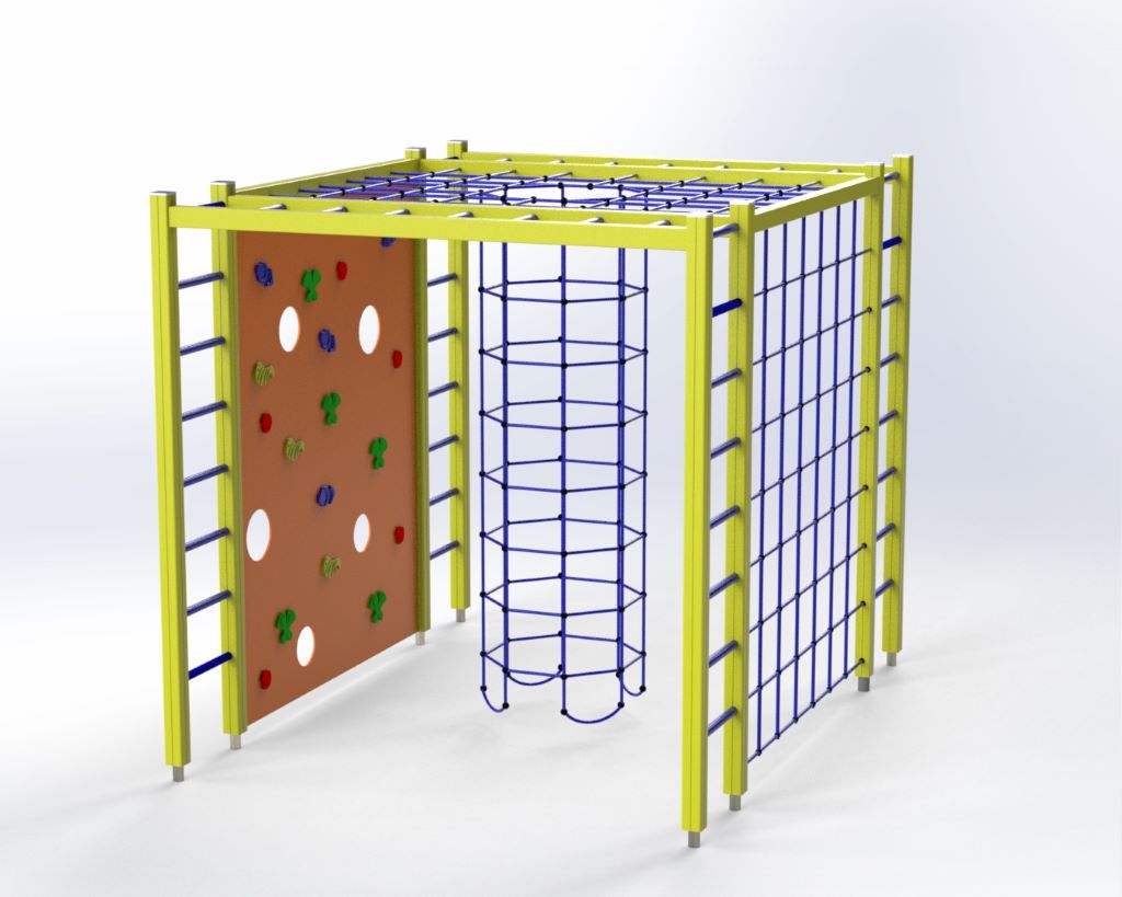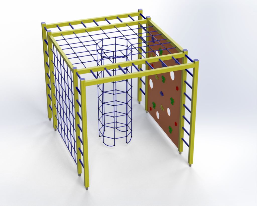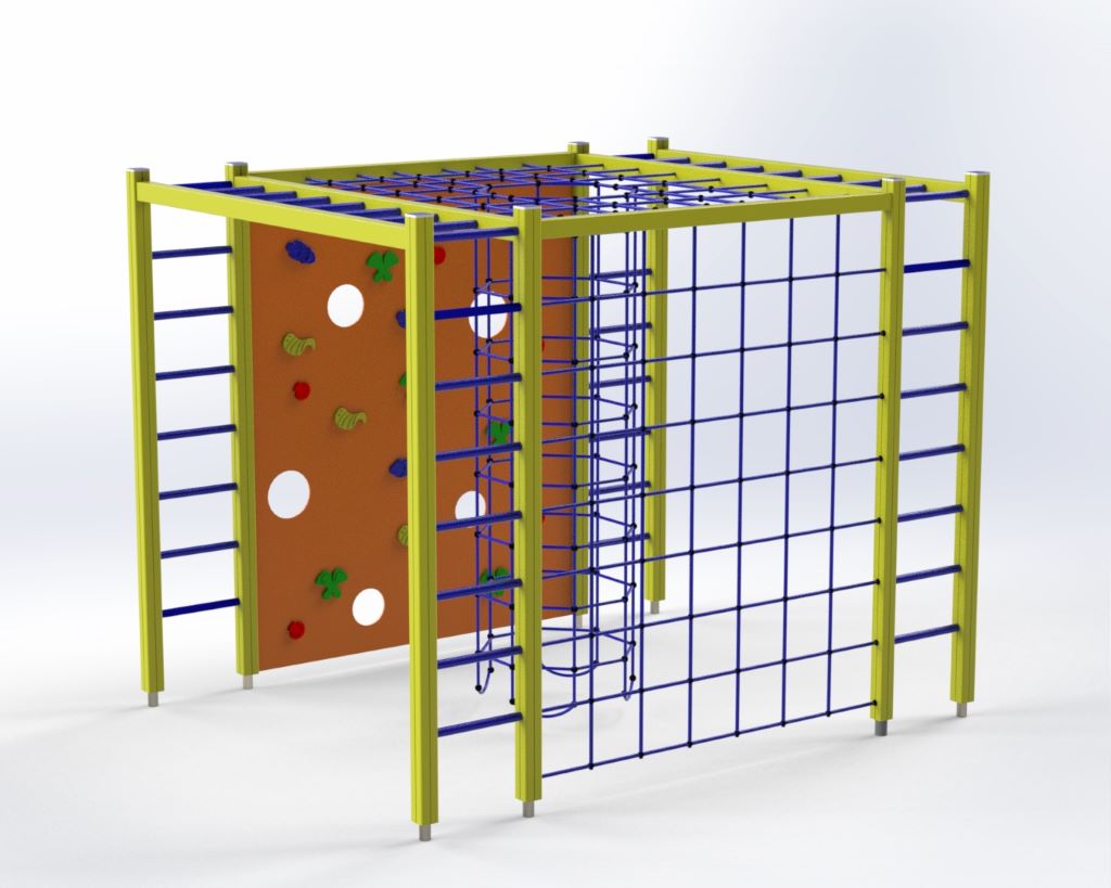 Susideda laipiojimo tinklo, laipiojimo kopetėlių laipiojimo sienelės ir vertikalaus virvinio tunelio.