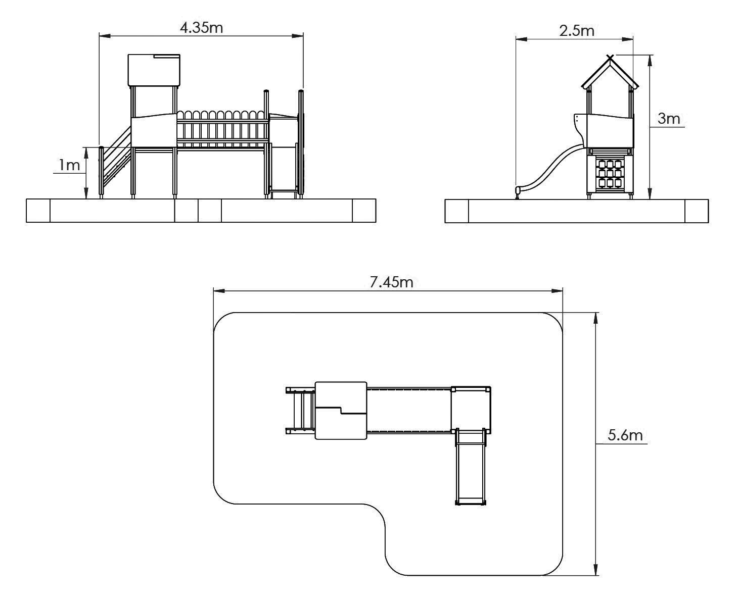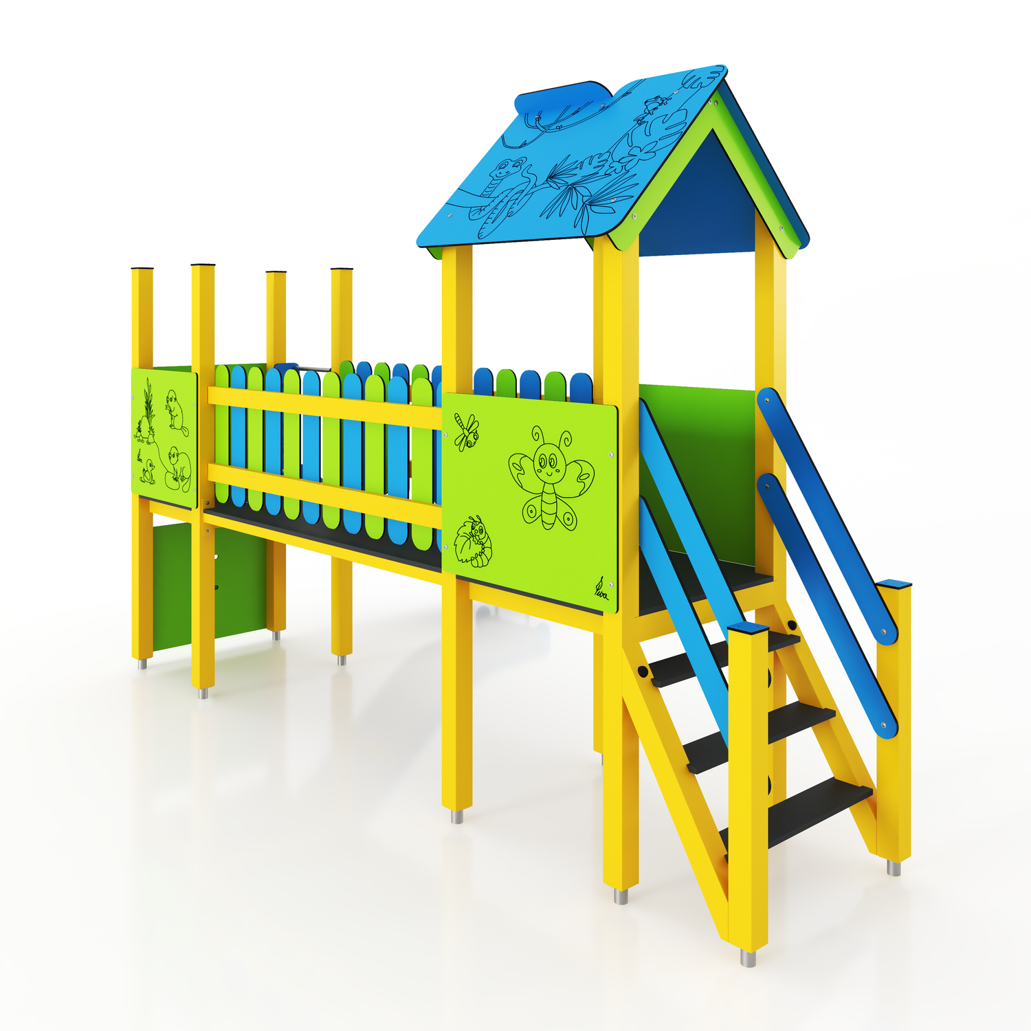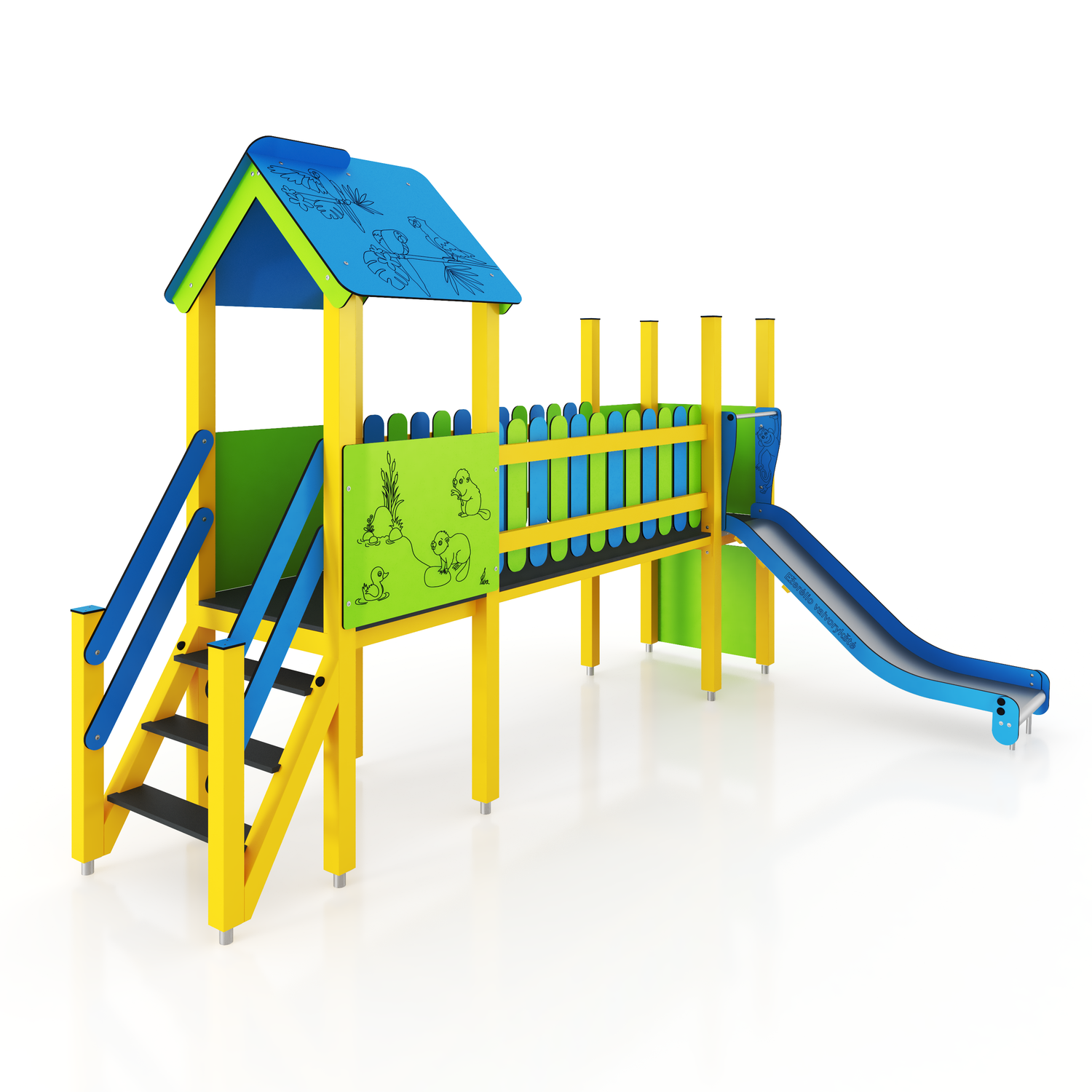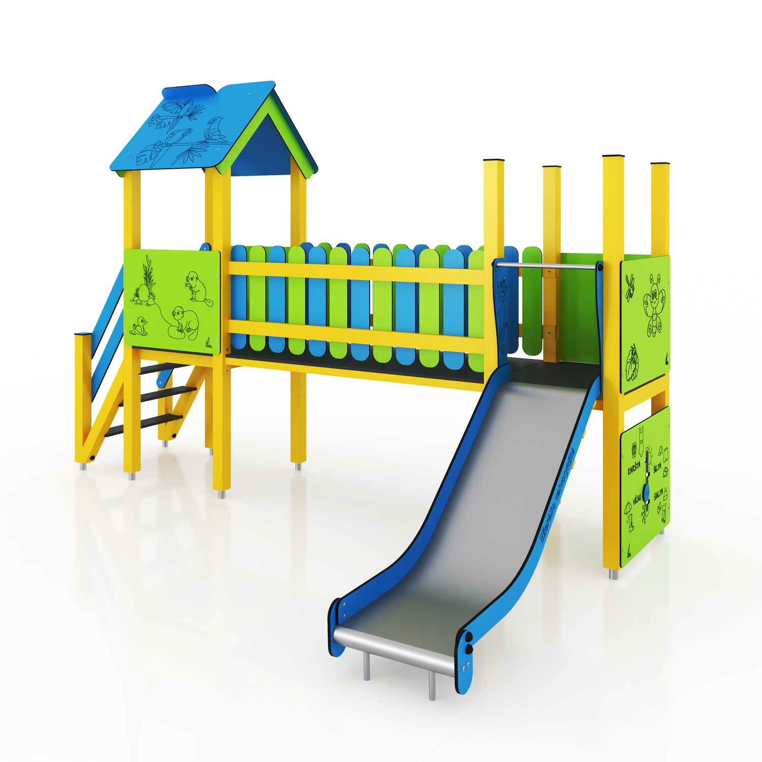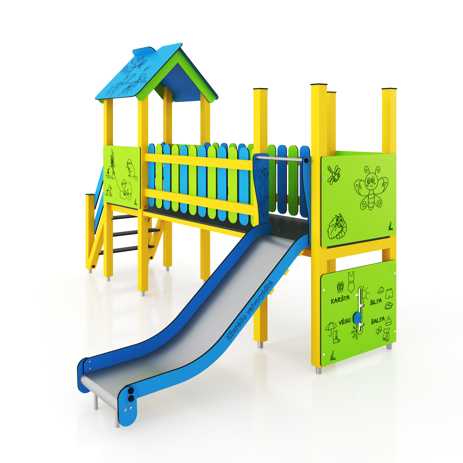 Dvi pakylos 1 m. aukščio, viena su stogeliu, sujungtos tiesiu tilteliu. Į įrenginį patenkama laiptais ir nučiuožiama čiuožyne nuo 1 m. aukščio pakylos.