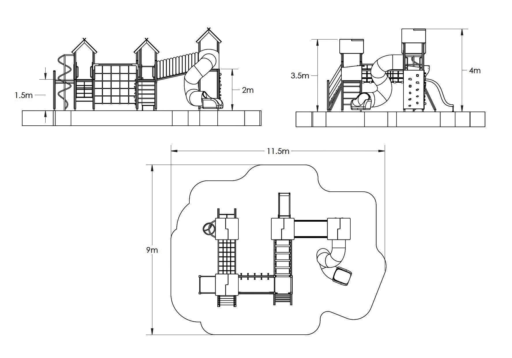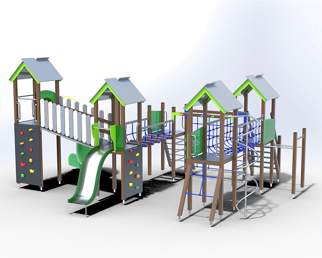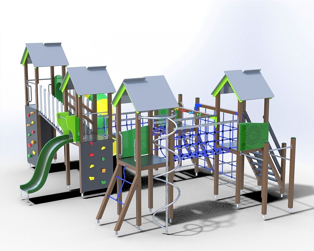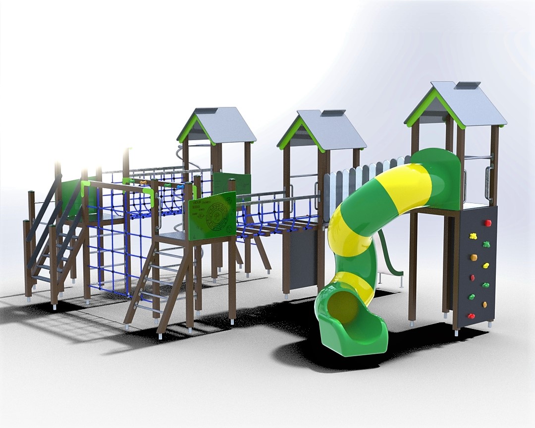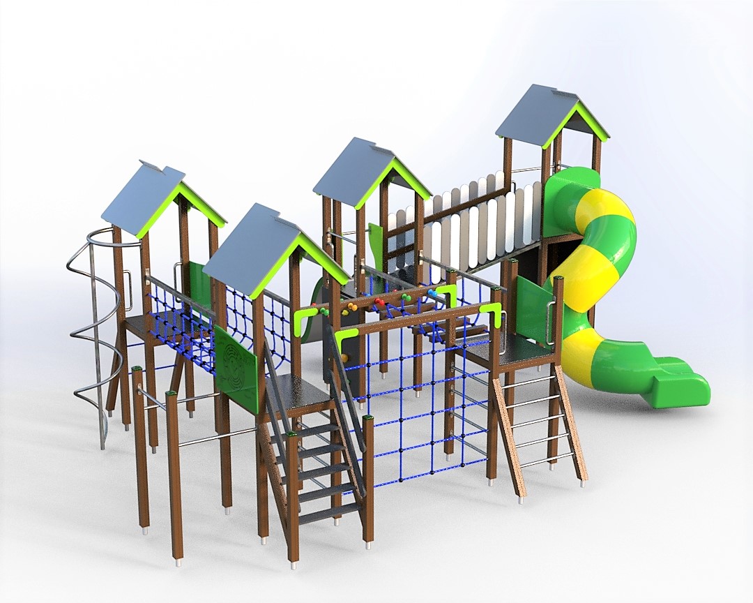 Daugiafunkcinis kompleksas. Keturios platformos su stogeliais, spiralinė čiuožykla, čiuožykla, gaisrininko stulpas,