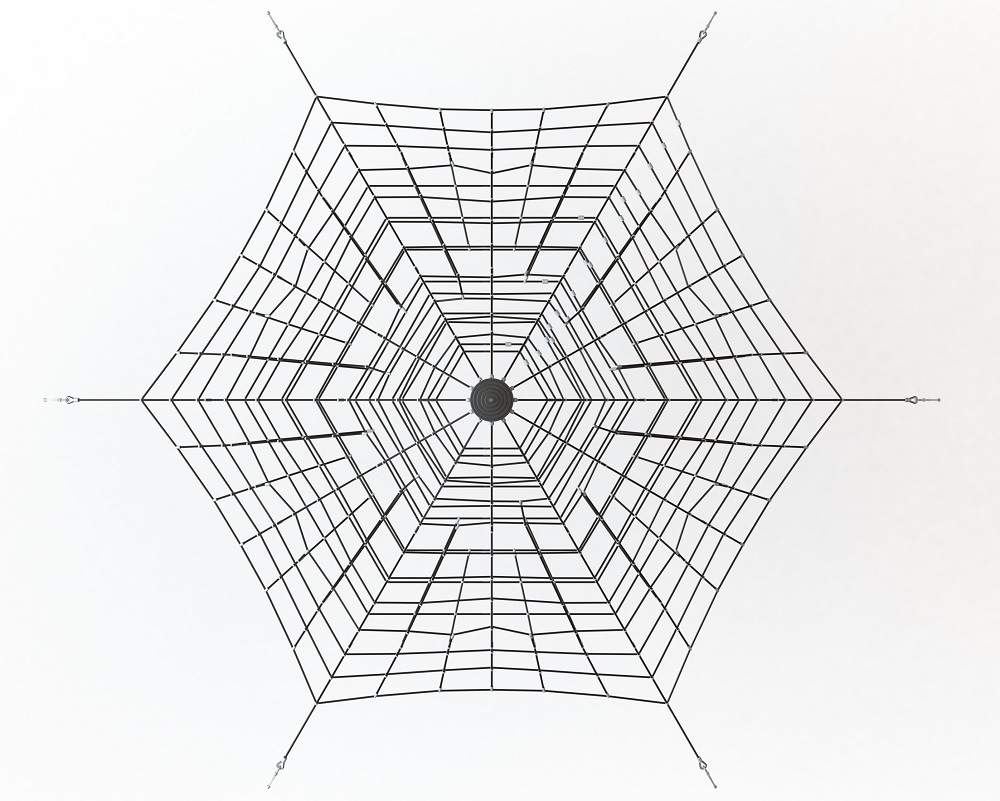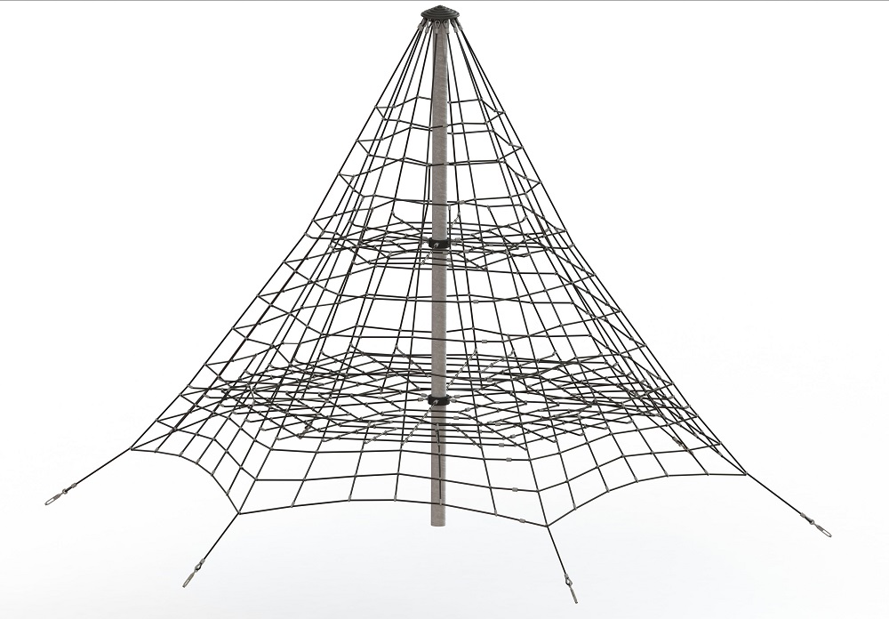 Erdvinė piramidė iš kombinacinės virvės. Aliumininės jungtys. Virvės skersmuo 18 mm. Gaminys betonuojamas.